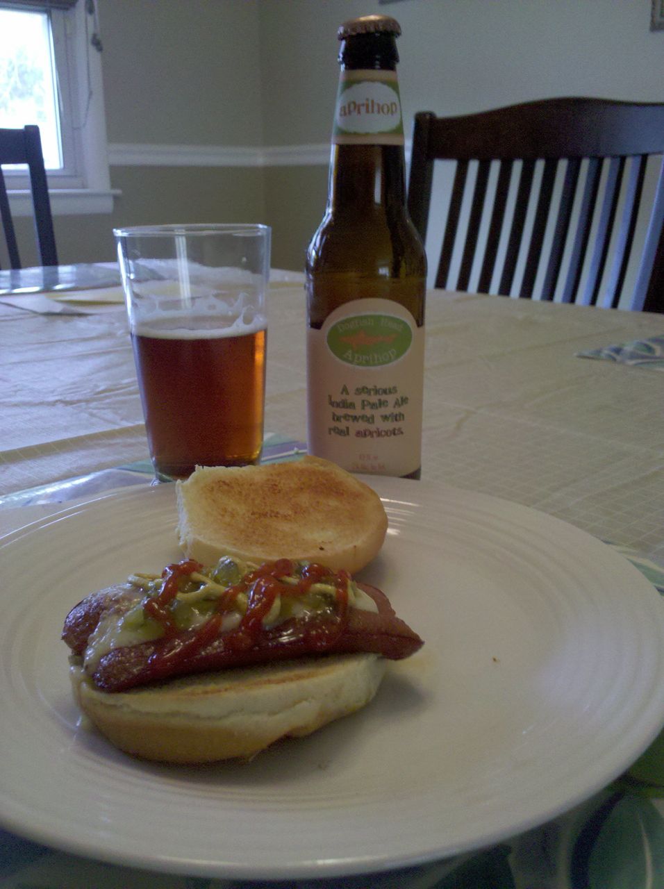 As far as what to drink, I opted for the Dogfish Head ApriHop. I first sampled this beer about a month ago and really enjoyed it (thank you Alemonger!). ApriHops has all of that IPA hoppiness (though not as much as their 60 or 90 minute IPA), but the apricots gives this beer a really interesting flavor dimension. The color is a deep amber and it pours slightly cloudy. Although it starts off like a conventional IPA, it finishes slightly sweet, and you can definitely taste the apricots. I would definitely serve this at a summer barbecue, but at 7% ABV, I wouldn’t recommend drinking this like you would a conventional summer beer. It definitely packs a punch!