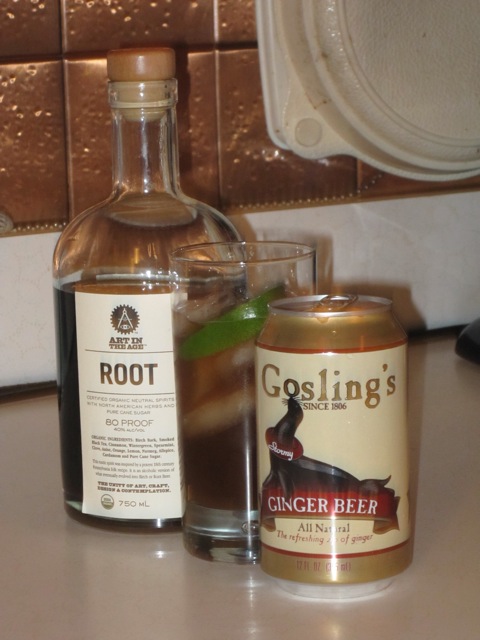 During my Friday night beer run, I stumbled upon six-packs of Gosling’s Ginger Beer. Since I am a huge fan of the Dark ‘N’ Stormy, I thought it would be interesting to see how the ginger beer would mix with Root. I filled a tall glass with ice and poured in 1 part Root and 2 parts ginger beer. I also added a wedge of lime. I really enjoyed this drink. The herbal flavors of the Root mixed very well with the sweet, spicy flavor of the ginger beer. If you’re looking for something different to drink this summer, give the Root ‘N’ Stormy a try. Think of it as a little bit of Old America and Bermuda in a glass.