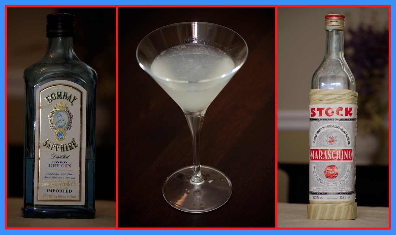 Shake the gin, the Maraschino, and the fresh-squeezed lemon juice well with cracked ice, then strain into a chilled cocktail glass and serve ungarnished.