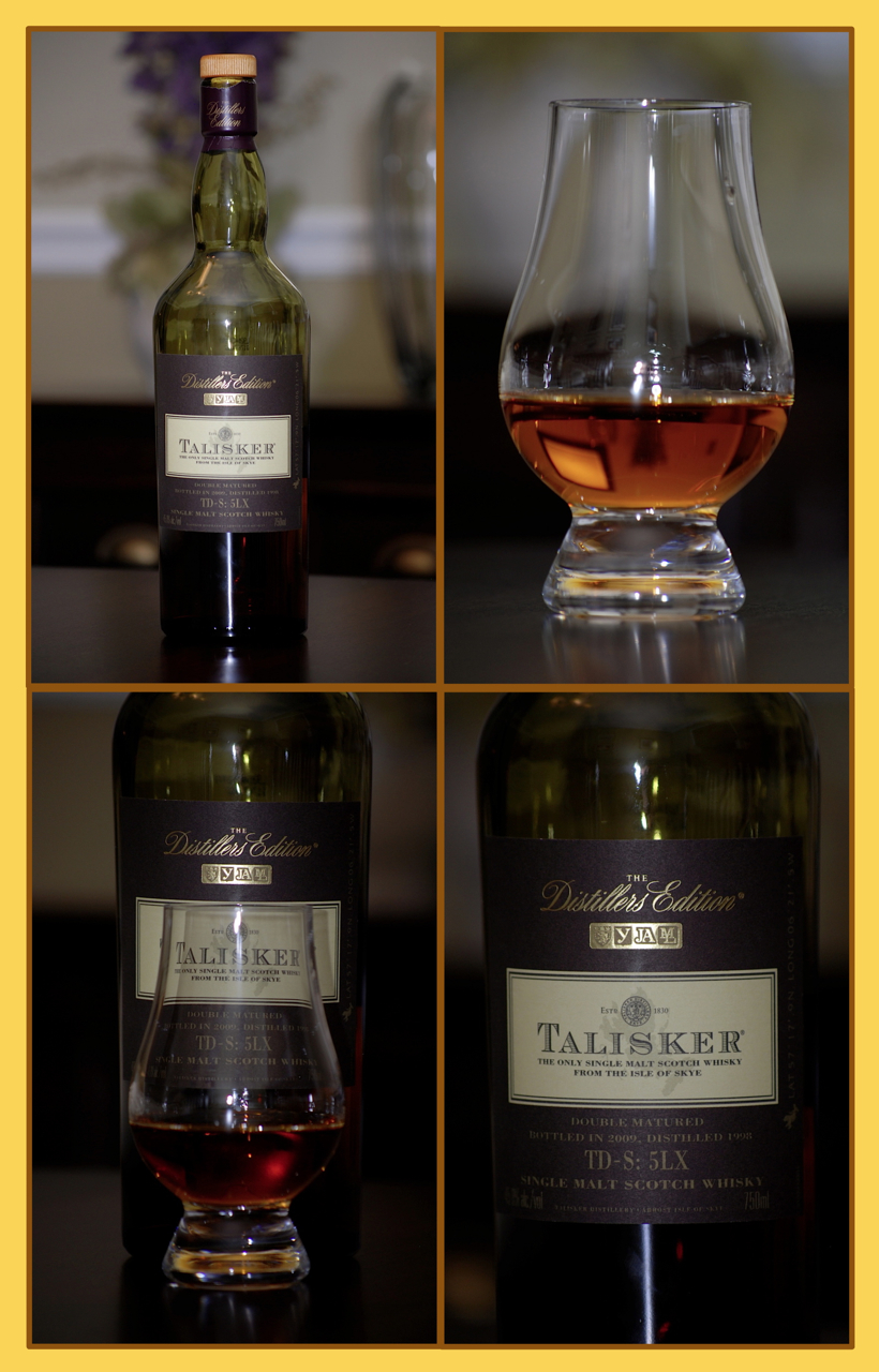 While browsing the whisky aisle at Total Wine, I stumbled upon a bottle of Talisker that I hadn’t seen before (I am a huge fan of the 10 and 18 year old Taliskers!). The Talisker Distiller’s Edition, which I eventually purchased after some mild contemplation, was distilled in 1998 and bottled in 2009, and has an ABV of 45.8%. This particular Talisker expression is double cask matured, i.e. it starts off in American oak casks and is then transferred to Sherry casks for a second maturation.