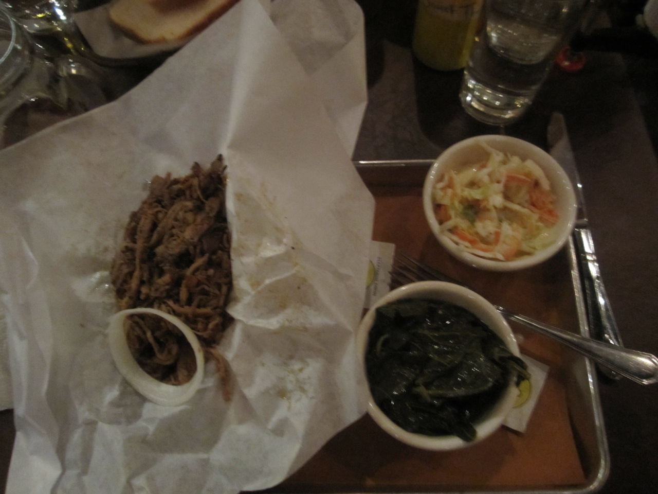 • Meats and Side Dishes: The  beef brisket was by far the best of the four meats. It was smoky, moist, and could be enjoyed with or without any BBQ sauce. We give the brisket an A-. The pulled pork and ribs were a distant second. They were good, but not very memorable. We give them a C+/B-. The sausage was the least enjoyable. I thought the casing was overly tough and the meat wasn’t very flavorful. All I tasted was smoke. I give it a D. I didn’t try the carrots or beans so I can’t give them a rating. The coleslaw and collared greens weren’t very memorable, so I’m giving them a C+.