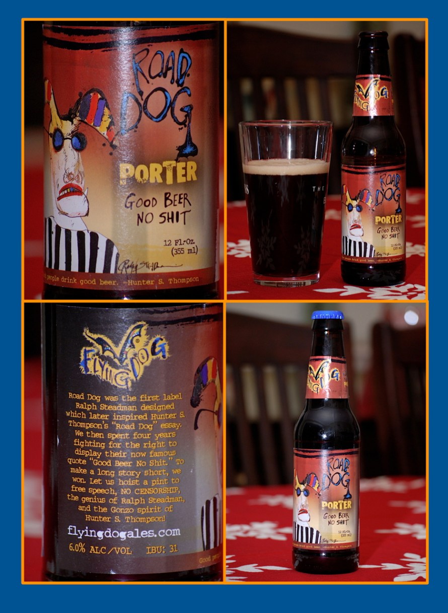 The first time I saw a bottle of Flying Dog beer, I immediately thought of the poster for Fear and Loathing Las Vegas, the Terry Gilliam film that starred Johnny Depp and Benicio Del Toro, which was based on the Hunter S. Thompson novel of the same name. It turns out that the brewers behind Flying Dog and Hunter S. Thompson use the same artist for their illustrations, a British cartoonist named Ralph Steadman. Flying Dog’s Road Dog porter is their first beer with a Ralph Steadman designed label, and to call it eye catching would be an understatement. But is the beer any good? That’s what we’re here to find out.