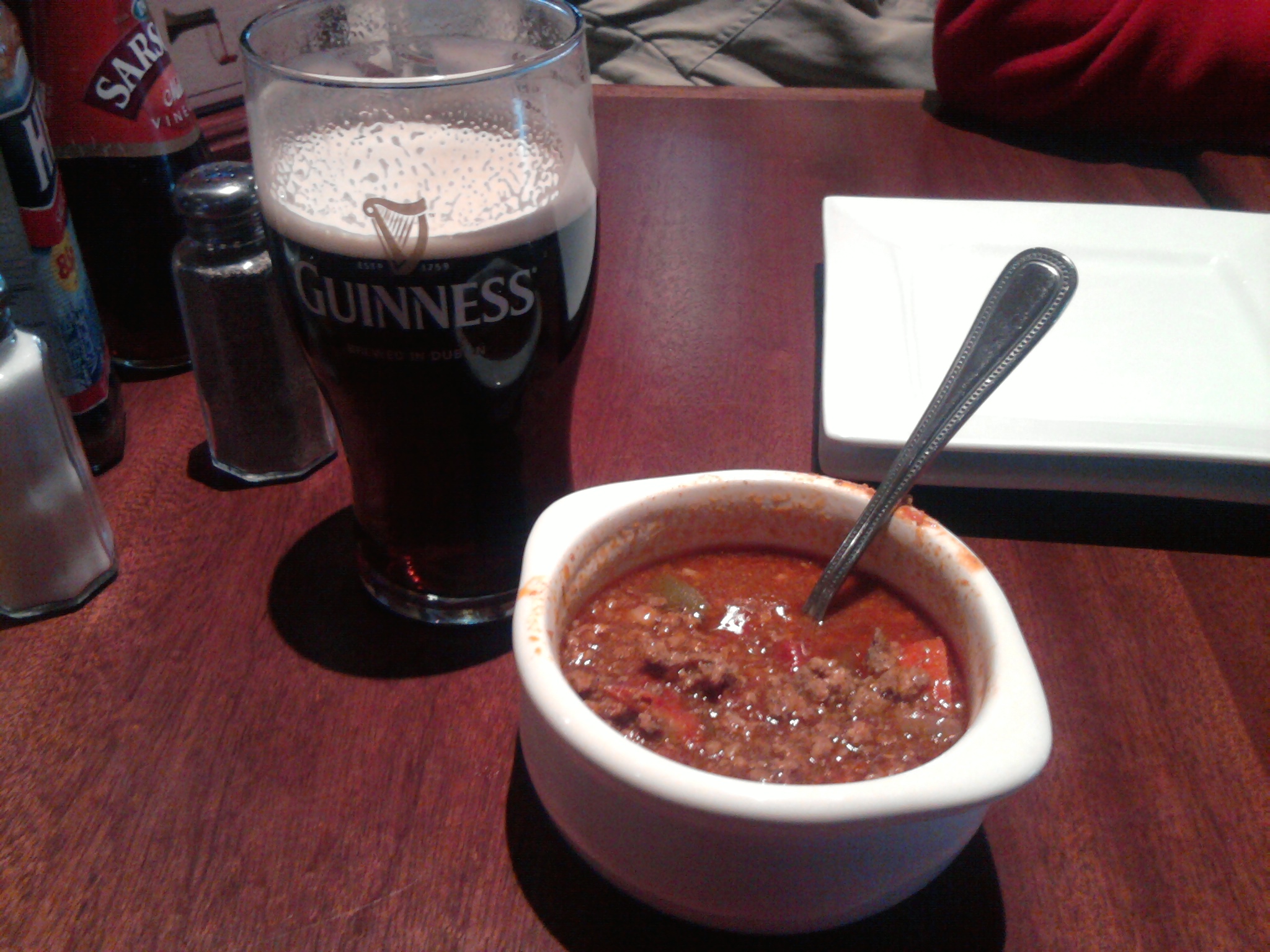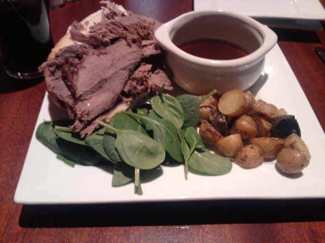 For my lunch I went with the carving station special. For under 10 bucks they offered a roast beef carving station complete with salads, veggies, and soup. It sounded like a good deal and did not disappoint. I started with soup which was chili with an Irish spin (beef and lamb with no beans). It was a great warmer for a cold day. The chili was followed by a roast beef sandwich assembled with the assistance of their carving chef served au jus with horseradish mayo. The sandwich was rounded out with a side of baby roasted potatoes and a spinach salad. (The also offered a macaroni salad and green beans which looked great but I did not try them). To accompany the meal I could have selected one of the craft beer offerings but instead had a Blacksmith (Guinness and Smithwick’s). [Side Note – Dublin Square passed it’s first test with the Blacksmith. At bars in the area I would have to explain the Guinness/Smithwick’s combo but the server and bartender at Dublin Square needed no explanation. At last a real local Irish Pub!]