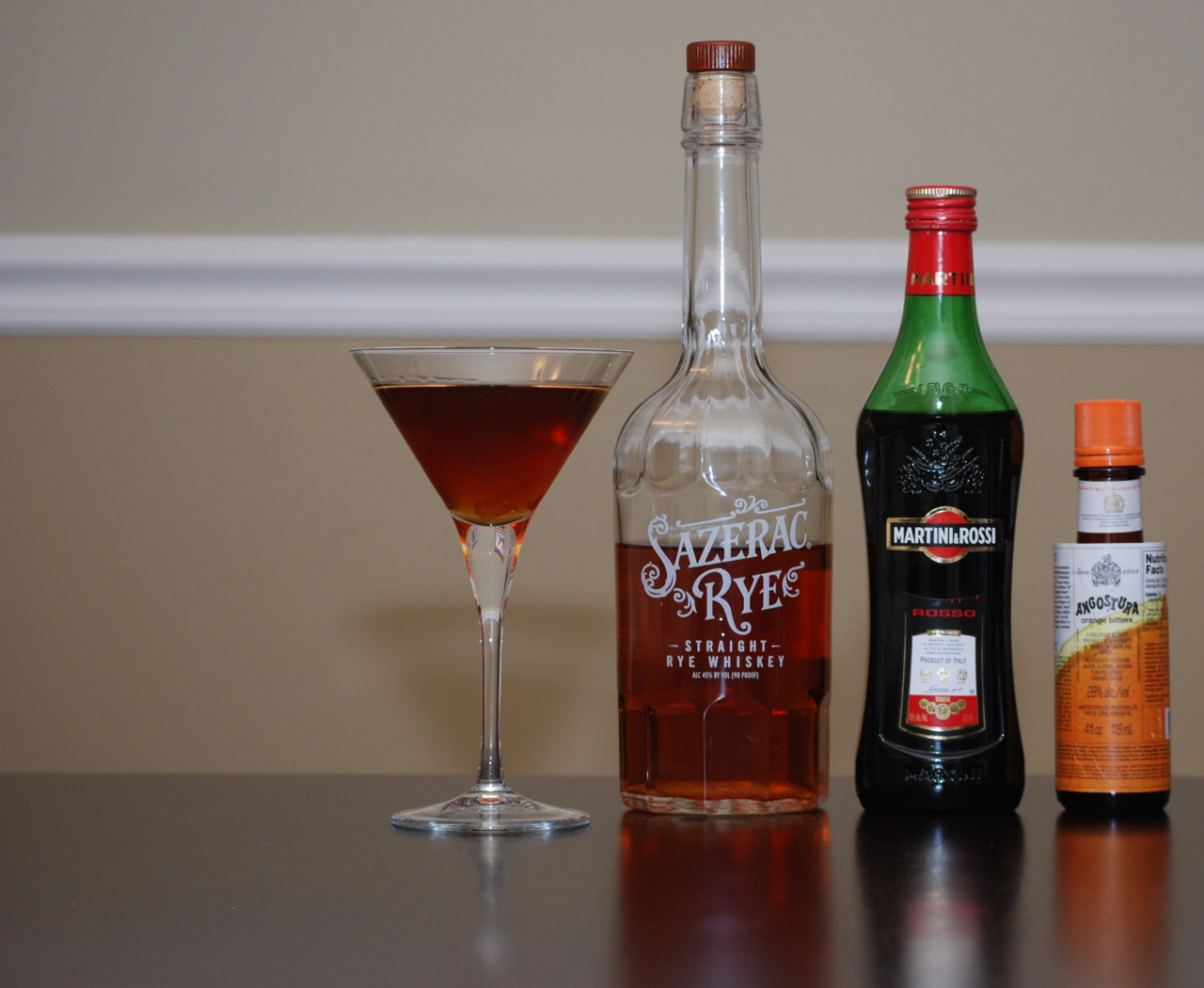 The same has happened to the Manhattan. Per the Wondrich article, the original recipe consisted of equal parts Straight Rye Whiskey, Sweet Vermouth, and a dash or two of bitters, while the Manhattan that I’m used to consists of about three parts Bourbon, one part Red Vermouth, a dash or two of Angostura bitters, and a maraschino cherry. I have never been a fan of the Martini (or at least what I’ve always thought of as a Martini), but I am a huge fan of the Manhattan. It’s a big, powerful drink that can do quite a bit of damage if you’re not careful! Since I happen to have a bottle of Sazerac Rye, I thought I would try to recreate what Mr. Wondrich claims to be the original Manhattan recipe…