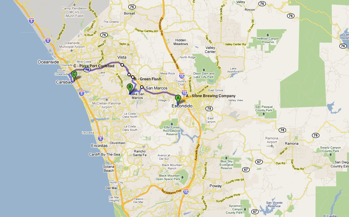 In case you were wondering, this beer gets it’s name from California State Highway 78 which connects the three breweries that were involved in this collaborative beer (Green Flash, Stone, and Pizza Port Carlsbad). Here’s what it looks like on the map: