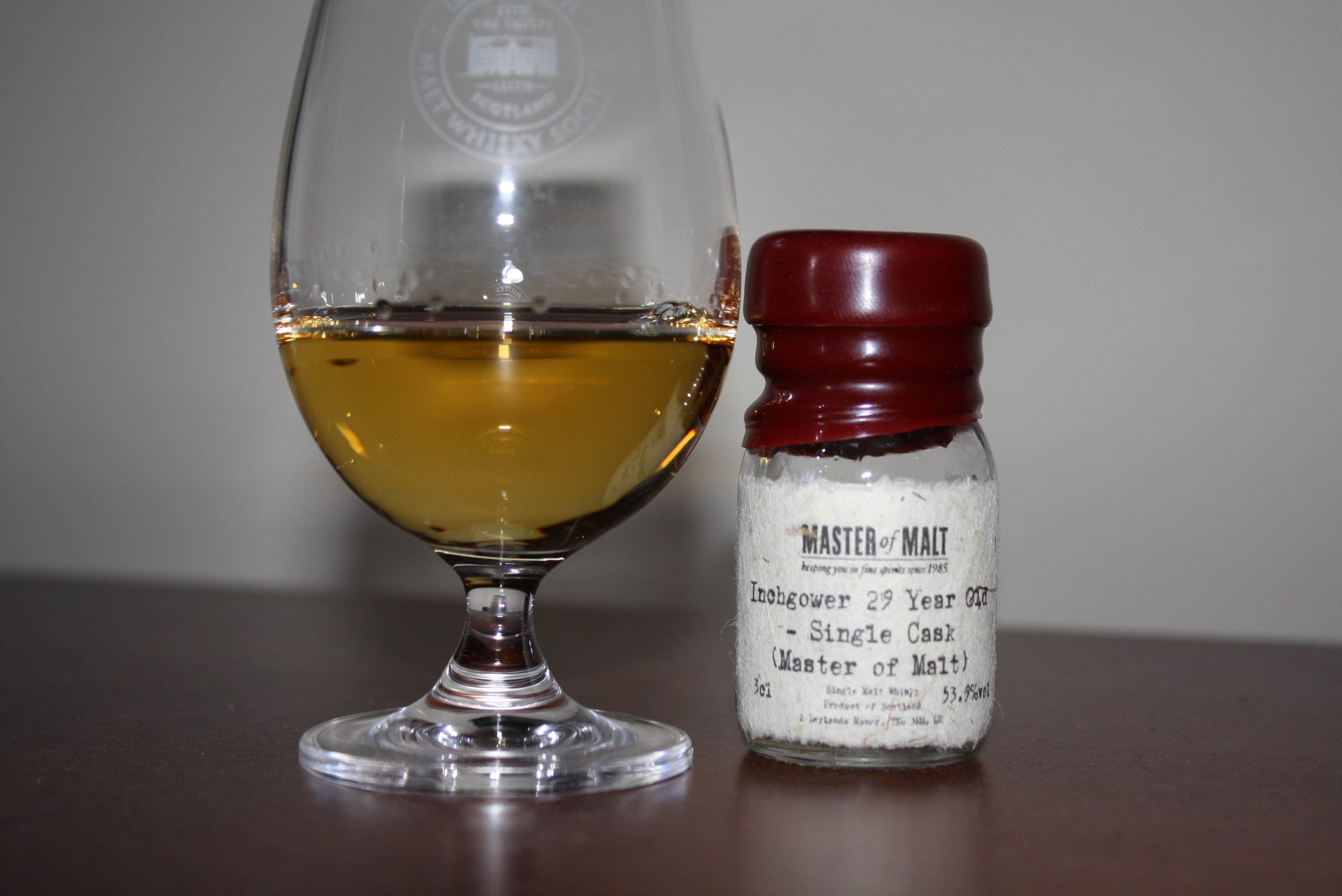 Awhile ago, the folks at Master of Malt sent a few samples our way and I selected the Inchgower 29 Single Cask as we divided the spoils. I chose the Inchgower because I had not tried anything from that distillery. It also didn’t hurt that it was well-aged and a single cask. Inchgower is located on the outskirts of Buckie, Moray and is considered a Lower Speyside Malt. The distillery now part of the Diageo empire, had long been operated by Arthur Bell & Sons Ltd and remains the major contributor to Bell’s blended whisky. Master of Malt obtained an Inchgower that was distilled in June, 1982 and then aged in a single refill hogshead until bottled by Master of Malt in November, 2011.
