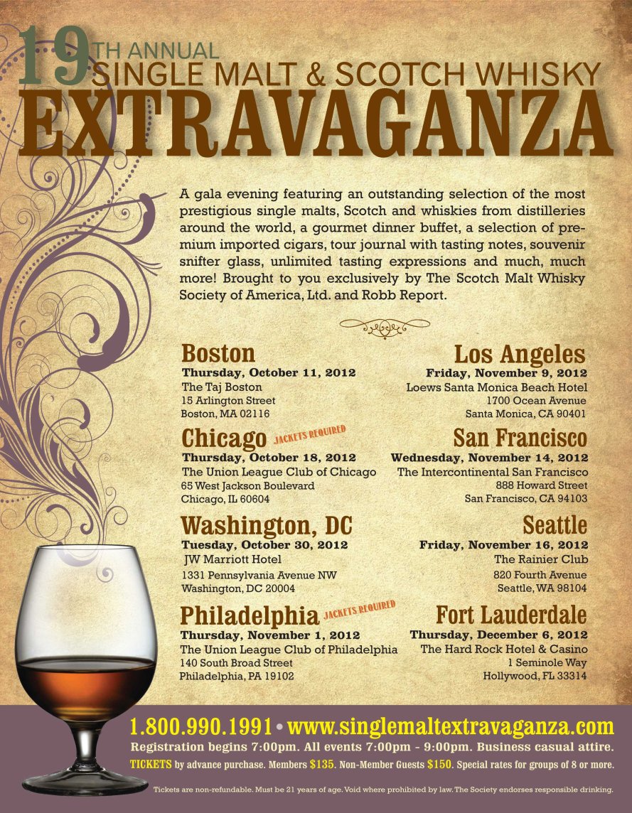As most of you are well aware, we are big fans of the Scotch Malt Whisky Society of America, and have attended the last five Fall Extravaganza events in Philadelphia, as well as the Spring Extravaganza event in New York this past May. A few days ago, I received an email from the Society announcing their Fall 2012 events lineup.