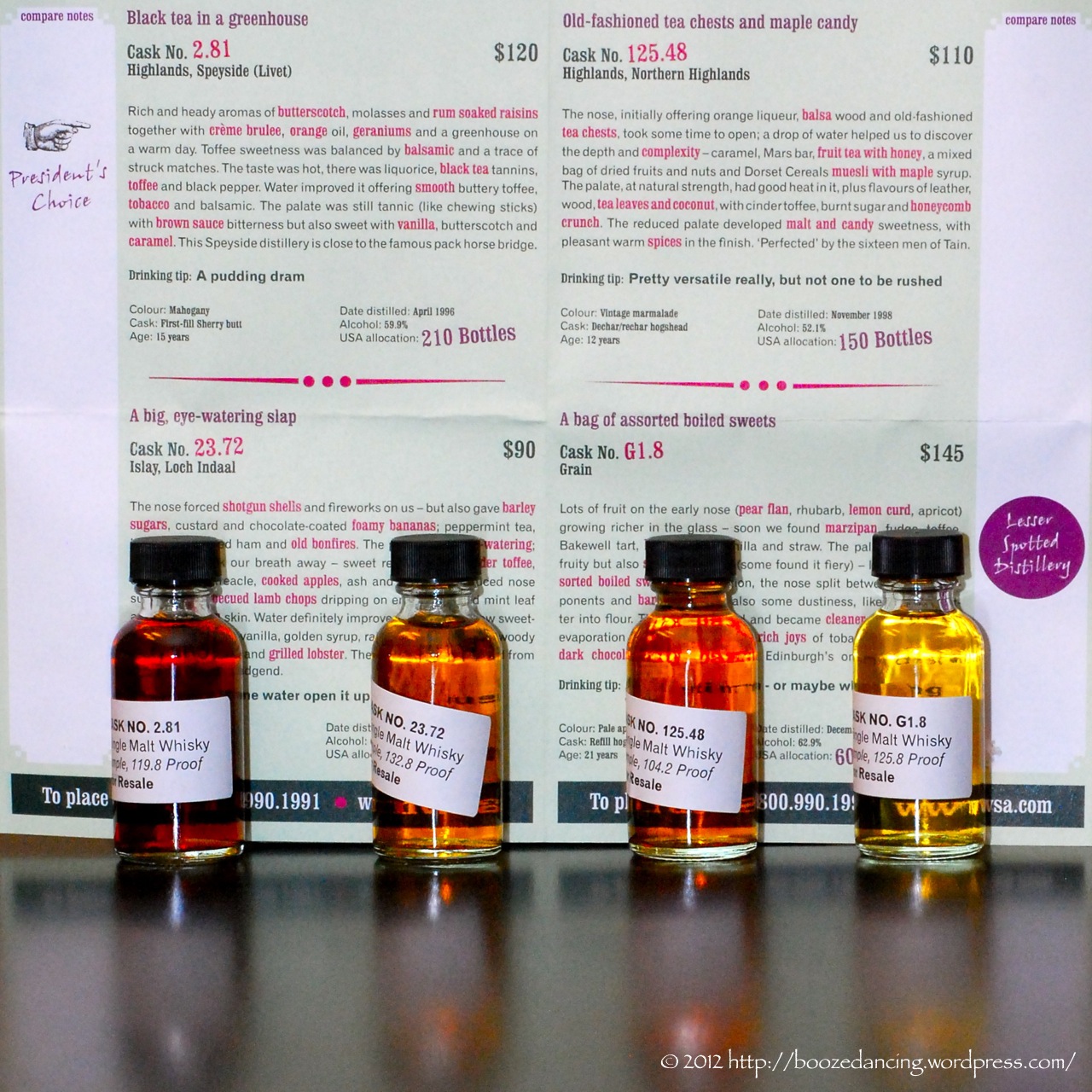 As we have done with the first two batches, Limpd and I split the four samples 50/50. Limpd chose Cask No. 2.81 and Cask No. 125.48, and I chose Cask No. 23.72 and Cask No. G1.8. Rather than post our reviews on an individual basis, we have decided to join forces and review all four whiskies in one post.
