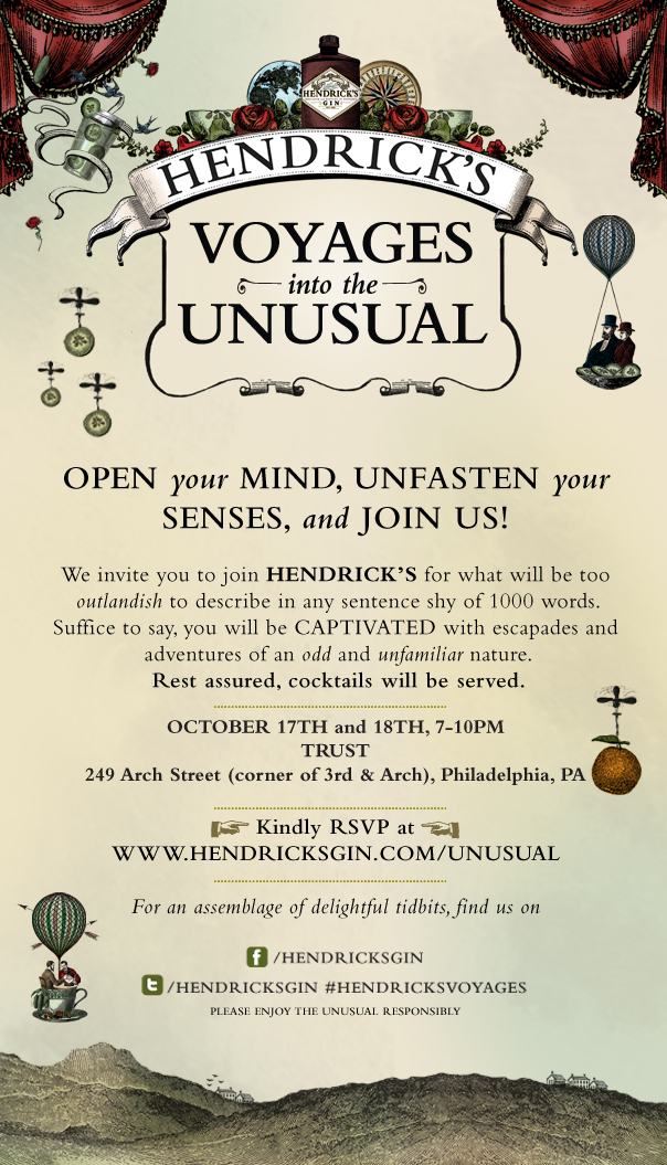 Philadelphia, PA (October 4, 2012)—The delightfully peculiar Hendrick’s Gin invites Philadelphians to open their minds, unfasten their senses and join “Voyages Into the Unusual” for two nights of extraordinary experiences from Wednesday, Oct. 17 – Thursday, Oct. 18, 2012. Hendrick’s Gin and fellow journeyers will bid farewell to the humdrum and venture beyond what is known at the events to take place at Trust, 249 Arch St. (corner of 3rd and Arch St.) The curious and cavalier can RSVP for the event at:hendricksgin.com/unusual.