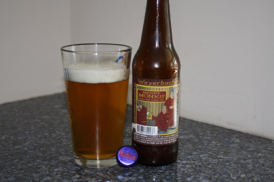 As a part of a mixed six, I picked up a bottle of Weyerbacher’s Merry Monks. Since I have had several Weyerbacher’s (the Double Simcoe IPA and the Slam Dunkel) in the past, and heard G-LO sing the praises of the Merry Monks,  I thought I would give it a go. The Merry Monks is one of the year-round beers produced by Weyerbacher. Per their website, Merry Monks is described as a Belgian Style Tripel Ale, while the bottle that I purchased had a label saying that it was a Golden Ale. Does this mean that there are two styles of Merry Monks or perhaps I picked up an older version? Either way, here is what Weyerbacher has to say about the Merry Monks on their website: