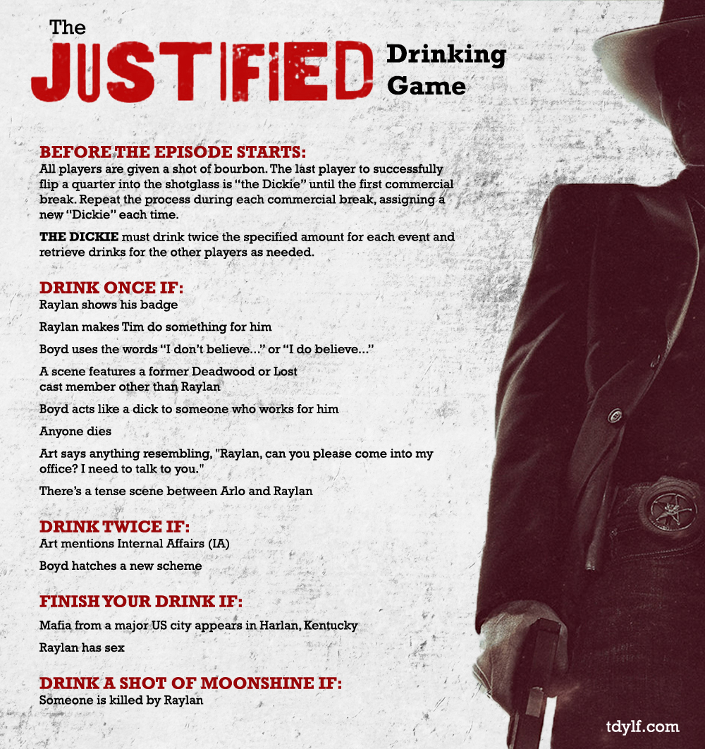 Bourbon. Moonshine. Apple pie moonshine. These are all tasty alcoholic beverages if you’re in Kentucky. They’re especially great beverages if you’re in Harlan County, Kentucky as it’s portrayed on the FX network show, Justified. If you’re not in Harlan County, I’ve discovered a way to magically transport you there. Simply watch Justified and play this drinking game with your family, friends, significant others, pets, and fellow degenerates seeking an excuse to get drunker than a Harlan citizen on payday.