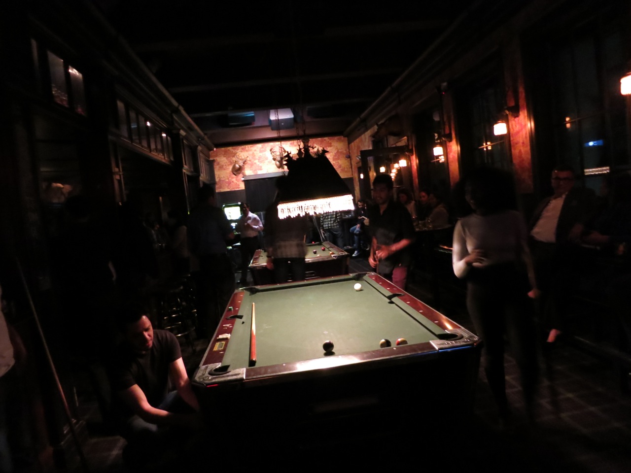 Go through the glass double doors, turn right, walk up the stairs, and there you’ll find a little slice of drinking heaven. As we wandered past the pool tables and seating on our right, we were greeted on the left by a magnificent booze and beer lined bar that runs along the length of the room. To say that the beverage selection was overwhelming would be a gross understatement!