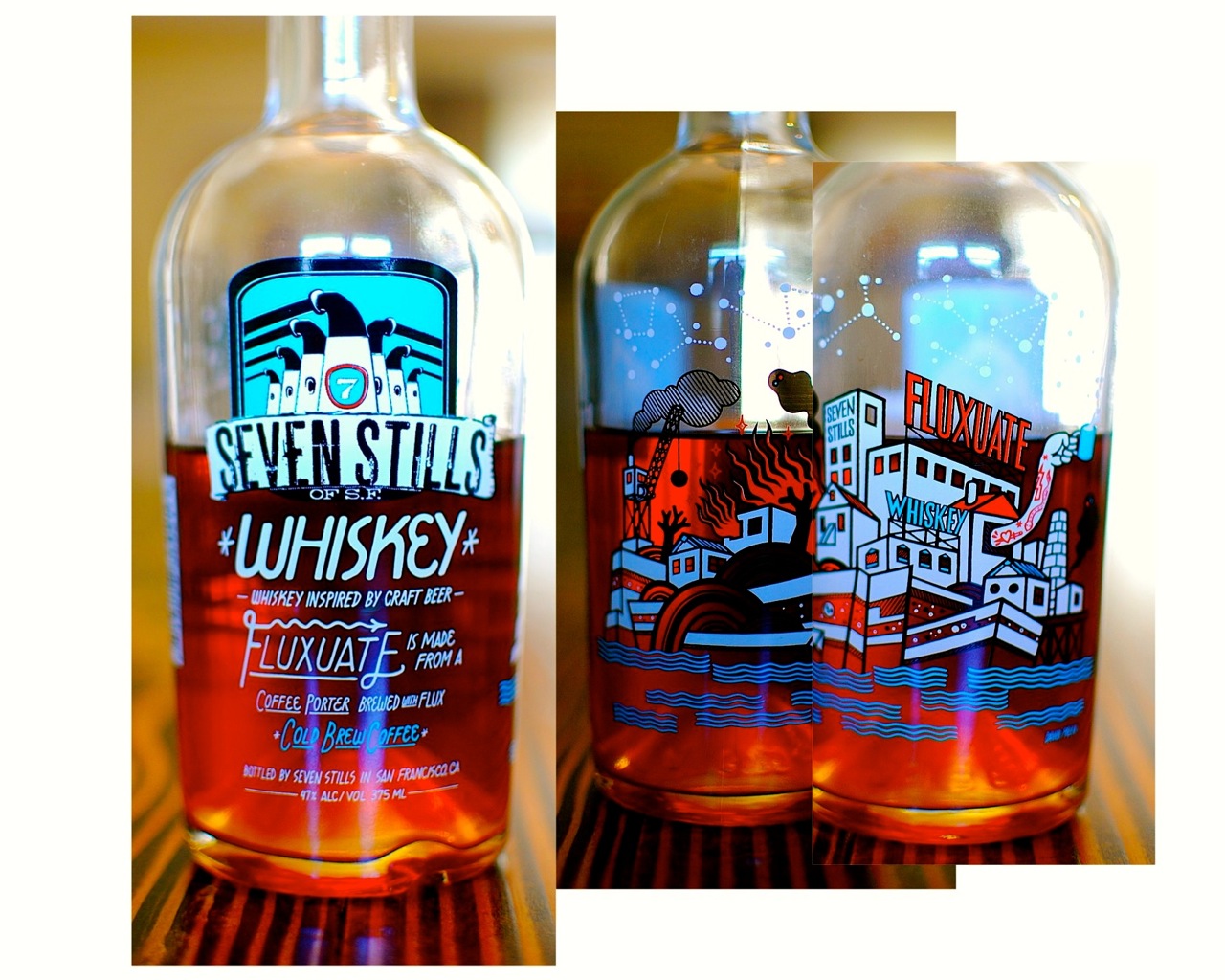The two whiskeys that he wanted me to try were made by an itty bitty distillery called Seven Stills of San Francisco. Based upon what I read on the “About Us” section of the Seven Stills website, it sounds like the founders of Seven Stills (Tim Obert and Clint Potter) took the phrase “Whisky is what beer wants to be when it grows up” to heart. What I mean is that instead of making a “distiller’s beer“, they decided to take their home brewing experiments and turn them into whiskey. After a year of experimentation, they decided to go pro and founded Seven Stills in 2013. They currently make three whiskeys (Whipnose, Fluxuate, and Chocasmoke) and plan to introduce many more once they get their new distillery up and running at the end of this year.