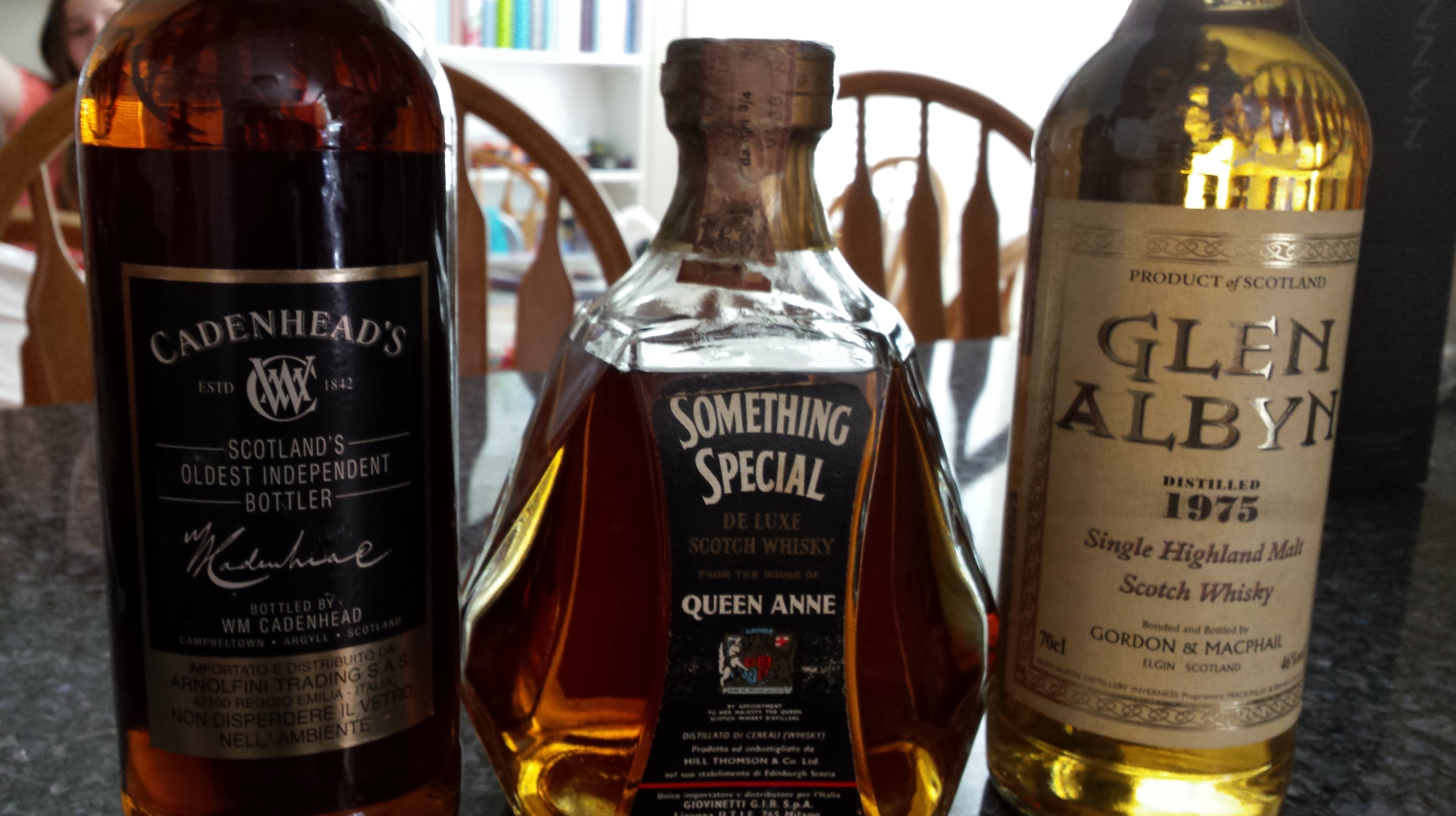 A while ago, I went on a family vacation to Italy. We hit a number of stops in Tuscany and then spent the last few days in Rome. As luck would have it, there was a great liquor store down the street from our hotel in Rome. G-LO had sent me in search of something from Samaroli and this was my first opportunity to do a thorough search. With my cheaters on, I lingered long over the counter as the whisky was shelved behind it. I must have lingered too long or looked too sad trying to read from that great a distance. The clerk took pity on me and suggested that I step behind the counter and have at it. While I did come across something from Samaroli, none of the bottles were from distilleries that I hadn’t already tried. As I moved from shelf to shelf, I was drawn to one that had a number of “dusties”. After several rounds of “Eenie meanie miney mo”, I selected a 22 yr. old Inchgower from Cadenhead, a bottle of Something Special, and a 29 yr. old Glen Albyn.