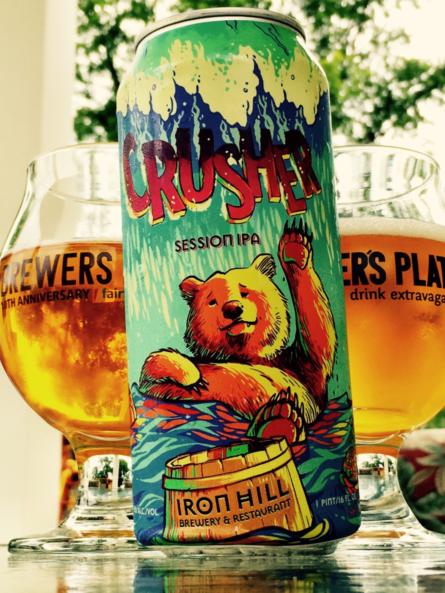 Once again G-LO ventured out to the mailbox and brought in his most recent bit of boozemail. The fine folks at Iron Hill had gifted him their most recent canned creation, the Crusher Session IPA. Shortly after mail call, he saw me outside watching the urchins and noticed that I looked a bit thirsty. Always a generous sort, he sought to remedy my thirst and proposed a joint review. Sort of like drowning two birds with one stone…er, well, something like that. Anyway, he ventured over and brought his lovely new can with him.