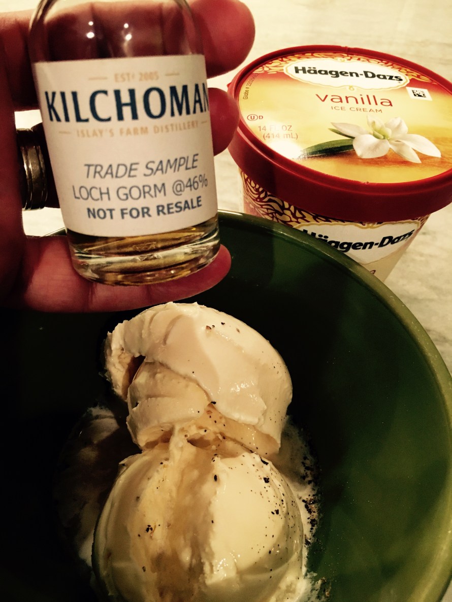 Kilchoman Loch Gorm + Haagen Dazs Vanilla Ice Cream + a dash of fresh cracked pepper = one supremely satisfying dessert! It was a little smoky, a little sweet, and a tiny bit peppery. And thanks to the Oloroso Sherry cask maturation of this whisky, it was just a wee bit fruity too. This combination of creamy ice cream and peaty whisky is a multi-layered flavor experience that I highly recommend. I say, “Go for it!”. You won’t be disappointed.