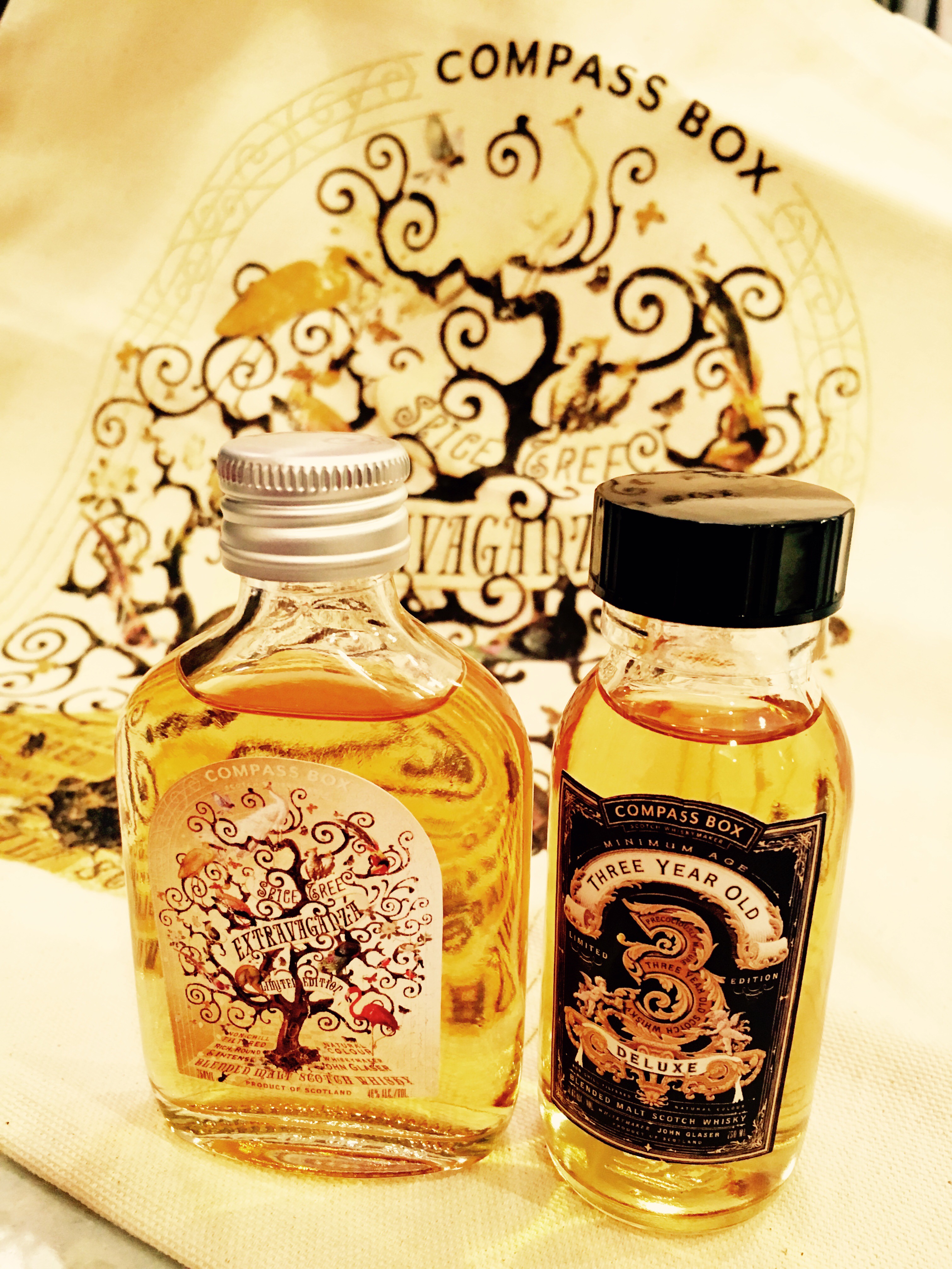 Once again, G-LO received his weekly booze mail shipment. In the mail, he received two samples from Compass Box: the 3 Year Old Deluxe and the Spice Tree Extravaganza (and a tote bag too which he used to carry the samples over to my hacienda. We love swag!). We have reviewed a number of Compass Box’s releases over the years (the Flaming Heart 2015 and This Is Not a Luxury Whisky, The Lost Blend and the Great King Street Glasgow Blend, Hedonism Quindecimus, Bern’s Limited Edition Blended Grain Whisky), so we are familiar with their blends and are big fans of the finished product. Needless to say, we were quite pleased with the package and couldn’t wait to dive into the samples.