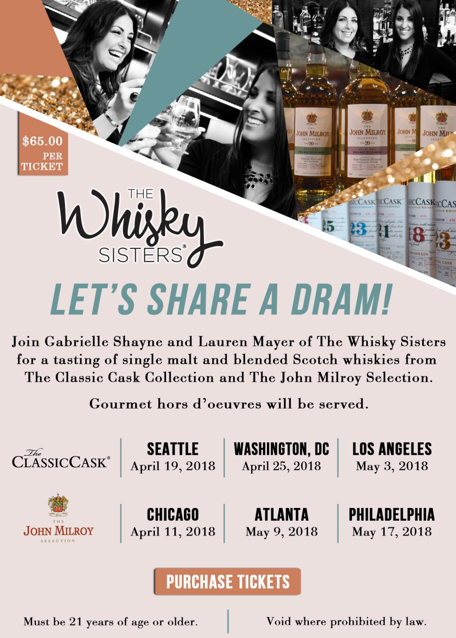 Loyal readers are well aware that we are veterans of many a Whisky Extravaganza (which was hosted and organized by Lauren and Gabby!), so rest assured when we say that Lauren and Gabby are bona fide whisky pros who know how to host a fabulous event. Whisky lovers in Chicago, Atlanta, and Philadelphia will have the opportunity to sample 12 different whiskies from The John Milroy Selection, while Seattle, Washington, DC, and Los Angeles whisky lovers will sample 14 different whiskies from The Classic Cask.