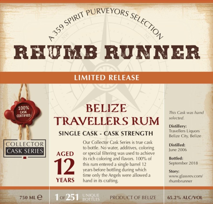 Very limited release -only 251 bottles worldwide. This Collector Cask Series, from Traveller Liquors in Belize City, Belize, is true cask to bottle. No water, additives, coloring or special filtering was used to achieve its rich coloring and flavors. 100% of this rum entered a single barrel 12 years before bottling, during which time only the Angels were allowed a hand in its crafting. Distilled June 2006, with our own selected cask, and bottled by us September 2018.