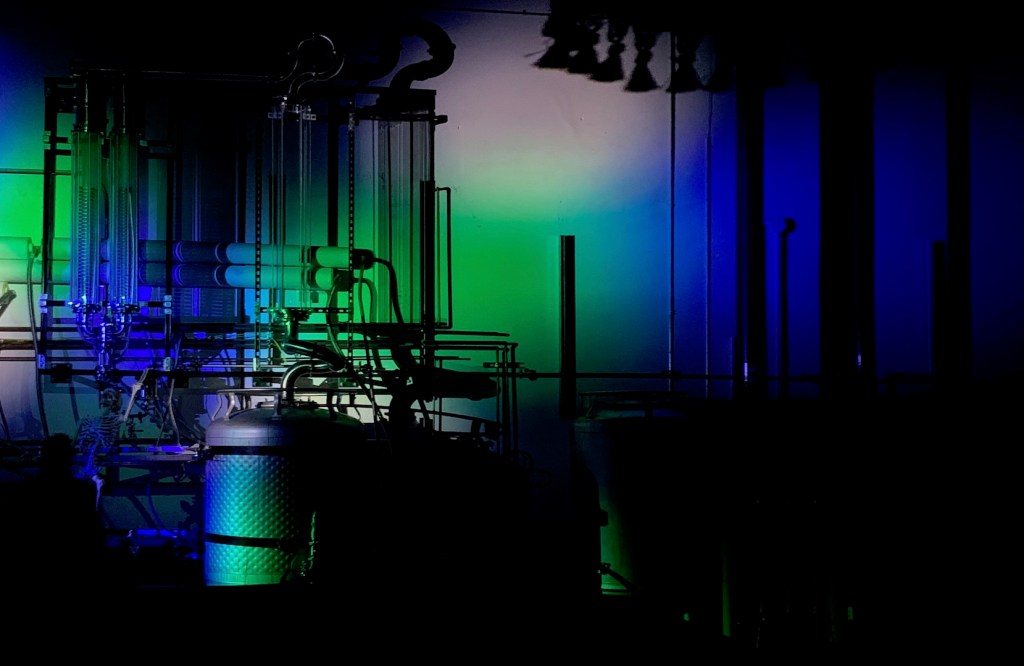 Of course, there’s a still. Why wouldn’t there be a distillation machine with tubes and pipes and knobs and doodads all cast in shadows like a Bauhaus show in London circa 1980?