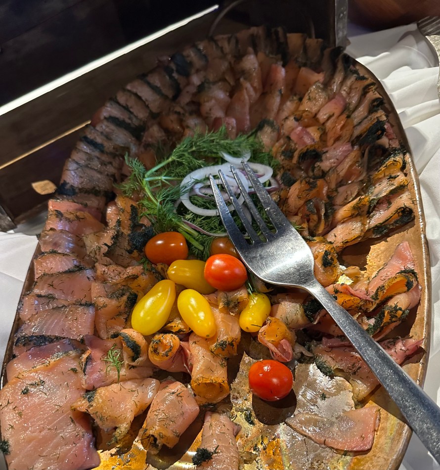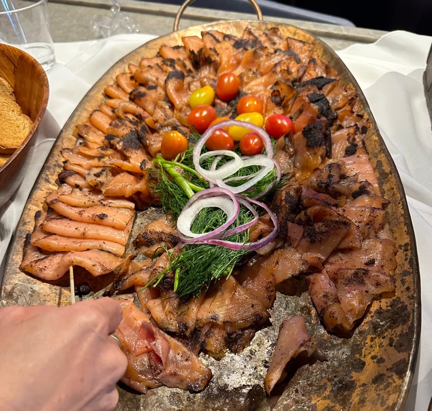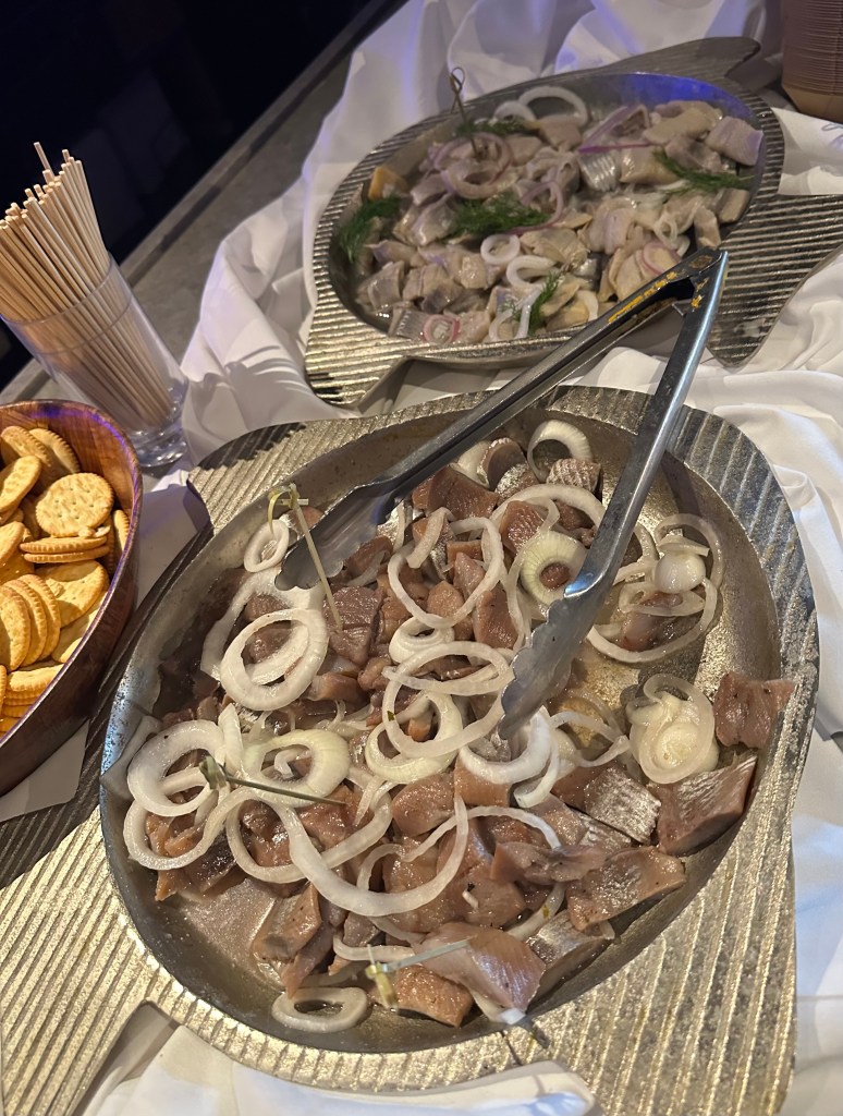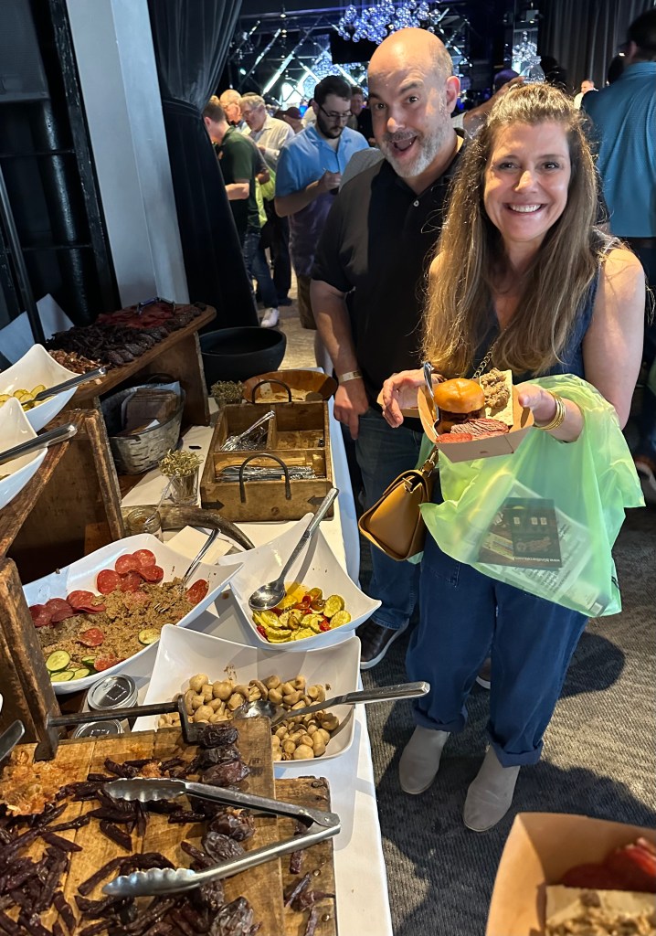 But what we really needed after a few drams was food. And we came to the right place as Kiddushfest is a two star show. Yes, we were not far from the bright lights of Broadway, and whisky may get top billing, but make no mistake about it, the food is more than a worthy co-star. It’s difficult not to get excited (and not drool) over Ari White’s barbecue. The Wandering Cue has a steady workload and fanbase in the tri-state area as Ari takes his mobile kitchen and smoker on the road endlessly. One day we’ll catch Mr. White out on one of his on-the-road stops to see the BBQ maven out in the fresh air feeding the peeps. Luckily we caught him for one night. His team always brings their A-game. No bad shooting nights for these guys. Brisket, salami, sausages, chopped liver, smoked salmon, pastrami salmon, herring, salads, and veggies. All delicious, all kosher, and all attendees very happy. Seconds? Thirds? Yes, have some!