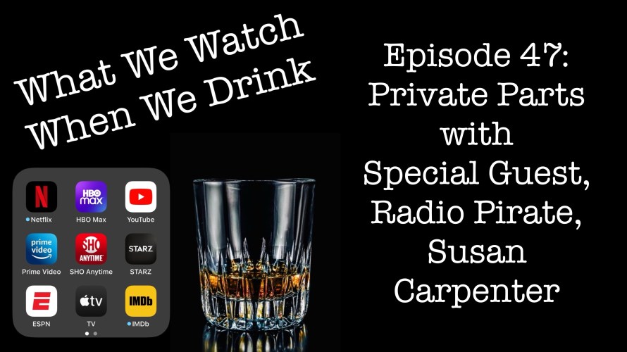 The Pirates of Podcasting are back with THE Pirate of Pirate Radio. What We Watch When We Drink welcomes journalist and broadcaster, Susan Carpenter, to the show to talk about her book, 40 Watts From Nowhere, and her foray into running an illegal radio station out of her apartment in the 1990’s! We’ll get the low wattage lowdown from Sue. We’ll also discuss another radio rebel, Howard Stern, and his 1997 autobiographical movie, Private Parts. From nerd to the King of All Media in two hours. And, of course, we’ll be sipping some choices from our private and rebellious whisky stashes.