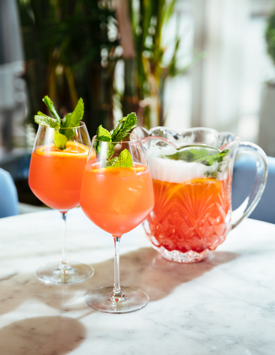Method: Add frozen Aperol to pitcher and top with prosecco and soda. Stir to blend and pour into balloon wine glasses. Garnish with orange wheel and mint sprig.