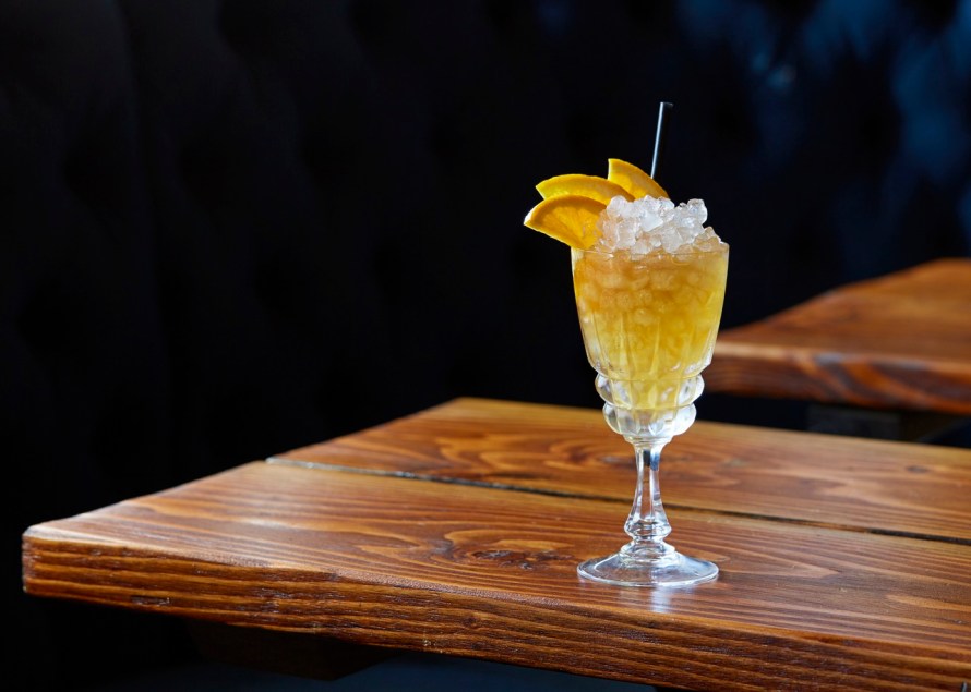 Method: Combine ingredients into a cocktail shaker and whip-shake briefly to combine. Strain into a chilled footed highball or cordial glass. Add crushed ice on top. Garnish with one or several orange wedges and add a straw.