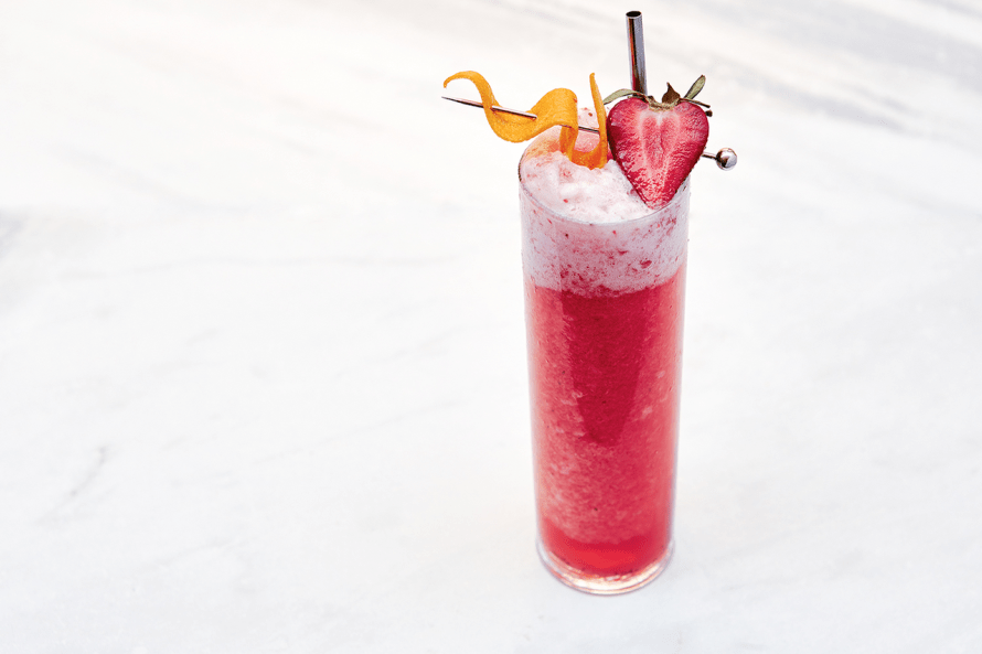 Method: Blend all ingredients (making sure tops of strawberries are cut off) with 1.5 cups of ice until smooth and pour into a tall glass. Garnish with a strawberry and orange twist.