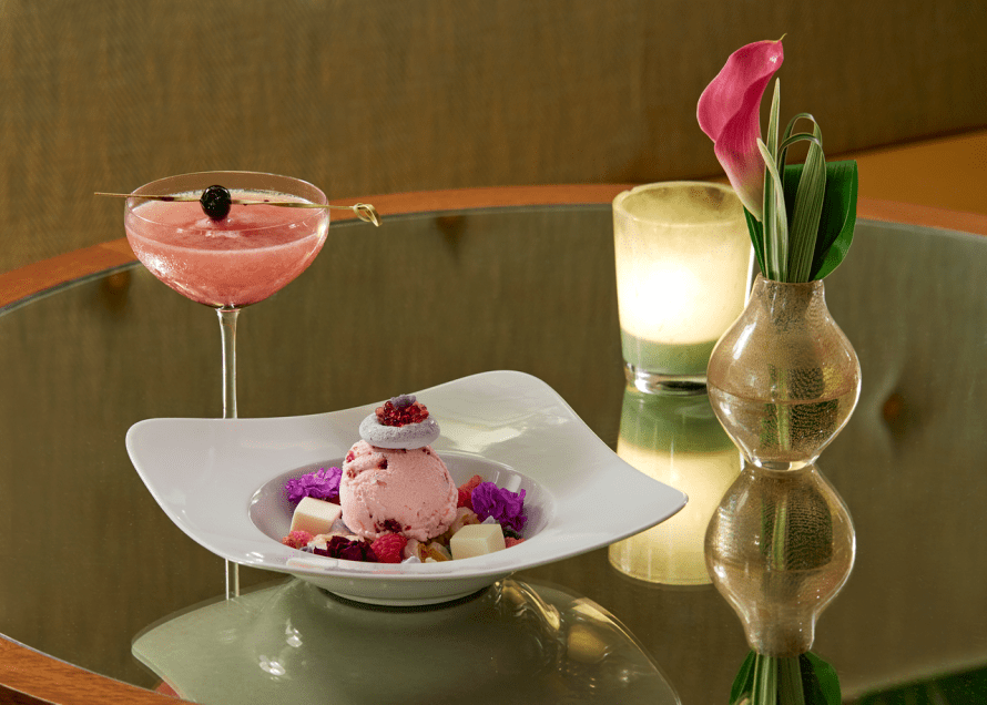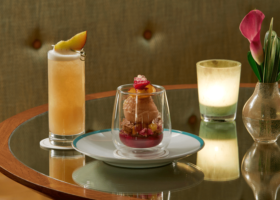 Paired with the Palm Court Summer Verrine, a Peach and verbena tea sorbet, raspberry and rose compote, ginger crumble, peach flower, crystalized rose petals, pink grapefruit pearls, juniper pound cake.