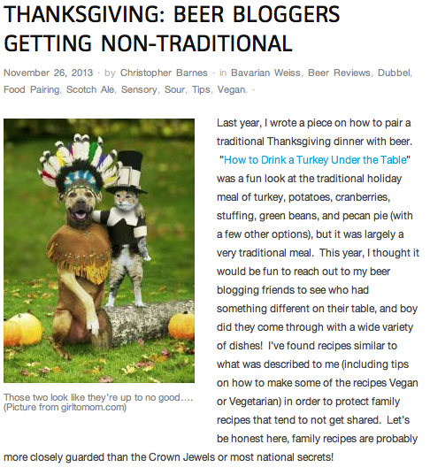 Our friend Chris of the I Think About Beer blog asked several of our Craft Beer blogging buddies (ourselves included) for some non-traditional Thanksgiving Day dishes so that he could apply his food/beer pairing skills to come up with a beer that would go nicely with what we […]